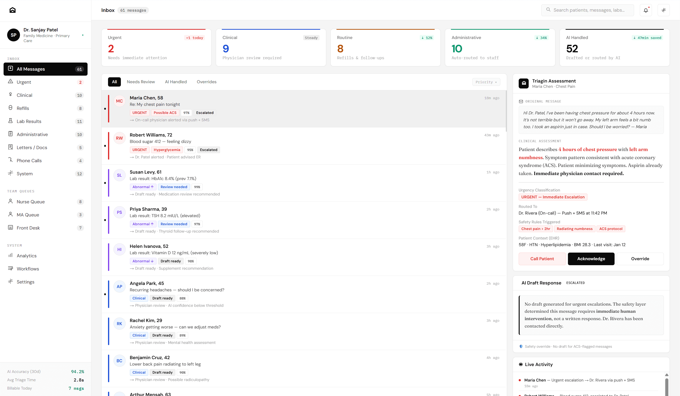 Messages go to the right person instantly. Refills to the MA. Scheduling to front desk. Normal labs to the nurse. Only genuine clinical decisions reach the physician — a curated escalation queue, not a firehose.